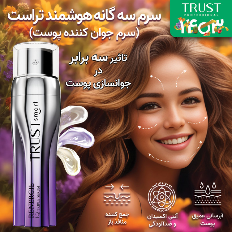 سرم سهگانه هوشمند تراست برای اولین بار به عنوان قویترین محصول حاوی سه نوع سرم روشنکننده، ضد چروک و جوانساز پوست در قالب یک محصول طراحی شده است.